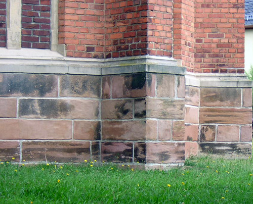 den Backsteinen ist aus schweren, rötlichen Sandsteinblöcken gebildet.