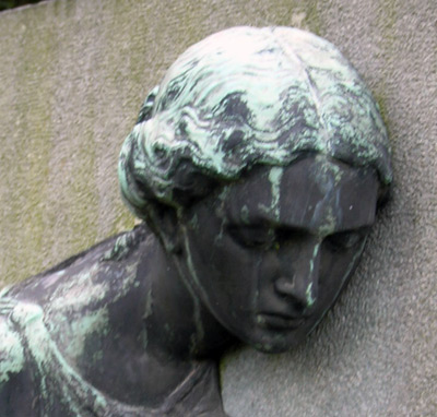 Die über den Stein gebeugte Figur bedeckt mit der rechten Hand ihre Augen.