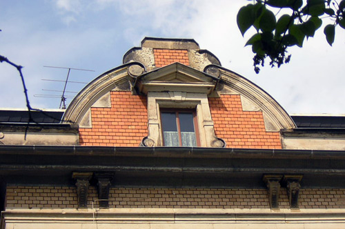 sind erfreulicherweise erhalten. Wir sehen neben der Grundfarbe der Fassade helle und dunkle Dekorziegel, daneben hochwertigen Sandstein, der sehr gut erhalten ist.